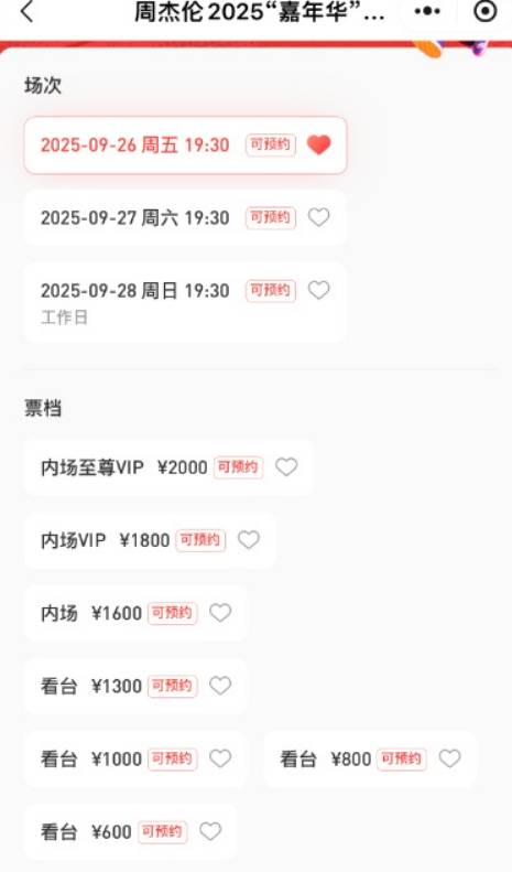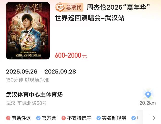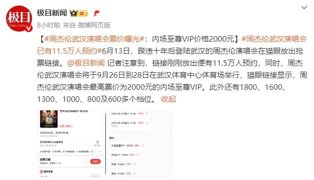 6月13日,暌违十年后登陆武汉的周杰伦演唱会在猫眼放出抢票链接。极目新闻记者注意到,链接刚刚放出便有11.5万人预约,同时,周杰伦武汉演唱会将于9月26日到28日在武汉体育中心体育场举行,猫眼链接显示,周杰伦武汉演唱会最高票价为2000元的内场至尊VIP。此外还有1800、1600、1300、1000、800及600多个档位。